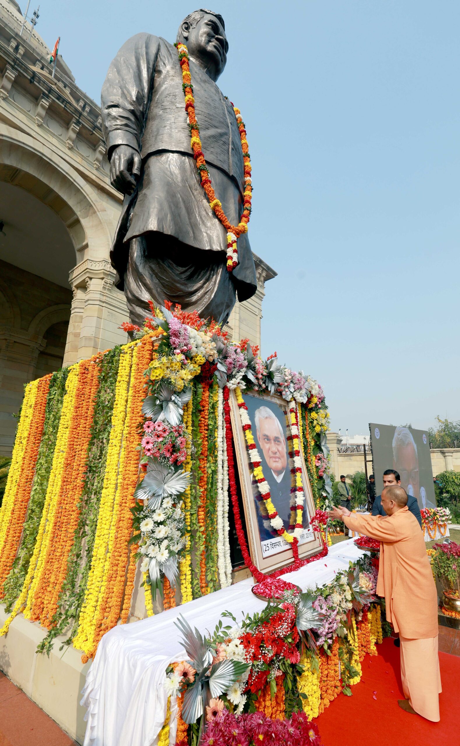 उत्तर प्रदेश के मुख्यमंत्री योगी आदित्यनाथ जी ने कहा कि भारत रत्न श्रद्धेय अटल बिहारी वाजपेयी जी का विराट व्यक्तित्व और कृतित्व देशवासियों को प्रेरणा प्रदान करता है। उन्होंने प्रदेश की राजधानी लखनऊ से प्रतिनिधित्व करते हुए प्रधानमंत्री के रूप में देश को विकास के नए विजन के साथ आगे बढ़ाने का कार्य किया था। डबल इंजन सरकार ने अटल जी की जन्म शताब्दी के अवसर पर उनकी स्मृतियों को जीवन्त बनाए रखने तथा विचार प्रवाह को निरन्तरता प्रदान करने के लिए लखनऊ में राष्ट्र प्रेरणा स्थल का निर्माण कराया है।