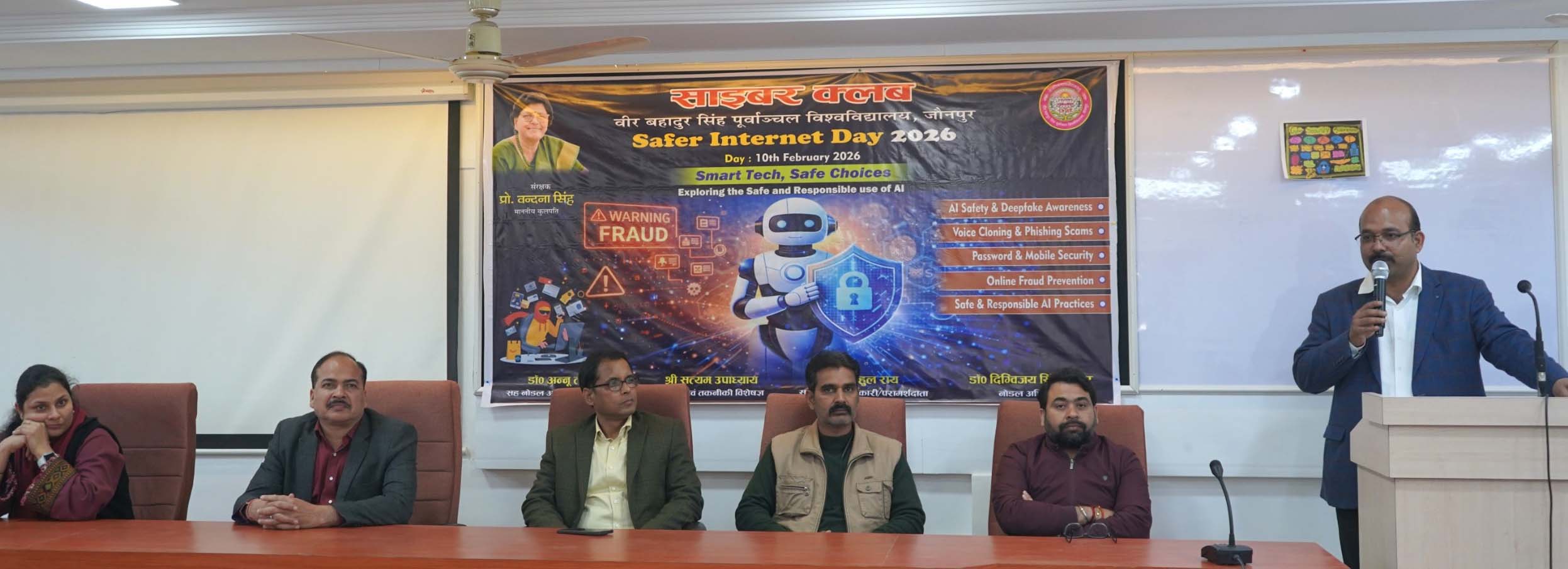 जौनपुर। वीर बहादुर सिंह पूर्वांचल विश्वविद्यालय, के संकाय भवन में साइबर क्लब के तत्वावधान में सेफर इंटरनेट डे 2026 के अवसर पर एक जागरूकता कार्यक्रम का आयोजन किया गया। कार्यक्रम की थीम स्मार्ट टेक, सुरक्षित निर्णय कृ एआई का सुरक्षित और जिम्मेदार उपयोग रही। कार्यक्रम में आधुनिक डिजिटल युग में बढ़ते ऑनलाइन जोखिमों तथा कृत्रिम बुद्धिमत्ता (एआई) के सुरक्षित एवं जिम्मेदार प्रयोग पर विशेष चर्चा की गई। वैलनेस सेंटर के समन्वयक प्रो. अजय प्रताप सिंह ने कहा कि बौद्धिक क्षमताओं के विकास के लिए कृत्रिम बुद्धिमत्ता का असंतुलित उपयोग खतरनाक हो सकता है। उन्होंने कहा कि जहाँ एक ओर इंटरनेट ने जीवन के अनेक आयामों को सहज और सुविधाजनक बनाया है, वहीं एआई ने कई नई चुनौतियों और समस्याओं को भी जन्म दिया है। मुख्य वक्ता इंजीनियरिंग संस्थान के डॉ. द्विवेंदु मिश्र ने सेफर इंटरनेट डे की थीम पर विस्तार से चर्चा करते हुए कहा कि इंटरनेट पर लगभग 90 प्रतिशत सुरक्षा हमारी “गुड प्रैक्टिसेज” पर निर्भर करती है, इसलिए सभी को सतर्क रहना चाहिए। उन्होंने कहा कि जब हम इंटरनेट का उपयोग करते हैं तो हम बहुत-सा डेटा साइबर स्पेस में छोड़ते हैं, ऐसे में सुरक्षा के उपायों से परिचित होना आवश्यक है। उन्होंने यह भी कहा कि आम व्यक्ति का डिजिटल व्यवहार निरंतर साइबर स्पेस में विश्लेषित किया जा रहा है और उसी आधार पर उसे लक्षित किया जाता है। विभिन्न संकायों के विद्यार्थी उपस्थित रहे.।
