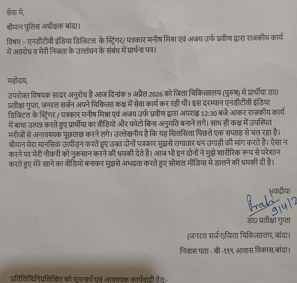 डॉ. प्रतीक्षा गुप्ता, जो जिला अस्पताल में जनरल सर्जन के पद पर कार्यरत हैं, ने अपने प्रार्थना पत्र में आरोप लगाया है कि एनडीटीवी के मनीष मिश्रा और अजय उर्फ प्रवीण (जो खुद को डिजिटल मीडिया से जुड़ा बताते हैं) उनके कार्य में लगातार बाधा डाल रहे हैं।